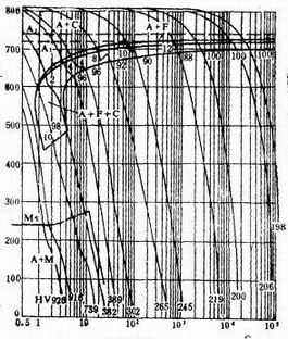 從圖中9SiCr鋼的連續(xù)冷卻轉(zhuǎn)變曲線圖分析,若得到完全馬氏體,在整個(gè)冷卻過程中,在600℃左右的范圍,要求冷速達(dá)到最大值,冷速大于等于臨界點(diǎn),不和S曲線的鼻尖處相交。在此處冷速越慢,發(fā)生鐵素體析出或非馬氏體組織的形成,馬氏體組織越少。此類鋼淬透性好,要求Ms點(diǎn)以下的冷卻速度緩慢,可減少變形和防止開裂。