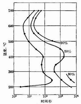 從圖中T8鋼的連續(xù)冷卻轉(zhuǎn)變曲線圖分析,若得到完全馬氏體,在整個(gè)冷卻過程中,在500-600℃左右的范圍,要求冷速達(dá)到最大值,冷速大于等于臨界點(diǎn),不和S曲線的鼻尖處相交。在此處冷速越慢,發(fā)生鐵素體析出或非馬氏體組織的形成,馬氏體組織越少。為了減少變形和防止開裂,要求淬火介質(zhì)在Ms點(diǎn)以下的冷卻速度緩慢。